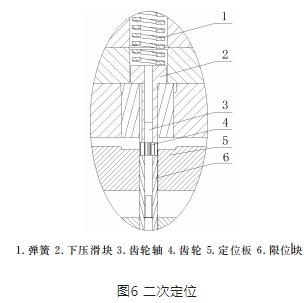 2、如圖6所示,機床下壓,齒輪軸的另一端插入下壓滑塊的內(nèi)孔,同時下壓滑塊在彈簧的作用下頂住齒輪進行二次定位。