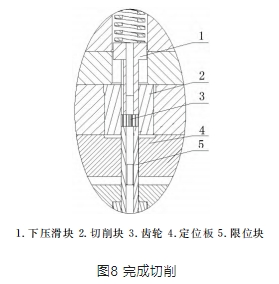2、如圖8所示,機床繼續(xù)下壓,帶動定位板下降,限位塊連同齒輪則一同頂入切削塊的切削孔內(nèi),這時切削完成,切削廢料則落入切屑回收槽內(nèi)。