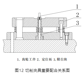 如圖11所示,限位塊托起毛坯齒輪,切削塊由上往下滑動,限位塊需要穿入切削塊進行完全切削,如果限位塊齒輪形外形尺寸過小,切削時則會引起塑料齒輪塌角、開裂;由參考文獻可知,沖壓切削凸凹模雙邊間隙應(yīng)小于0.01mm,但從切削夾具制造裝配精度和使用壽命考慮,該要求過高。根據(jù)生產(chǎn)實踐可知 ,只要切削塊和限位塊之間單邊邊間隙不超過0.02mm 就能保證齒輪精度和工件無塌角、無開裂。