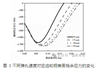 從圖 3 中可以看出,在距離齒輪鋼表面深度小于 0.05 mm 時,隨著彈丸速度的增加,對應的齒輪鋼表面的殘余應力幾乎不變。當彈丸速度從 51 m/s 增加至 95 m/s 時,齒輪鋼表面的最大殘余應力從 1 178 MPa增加至 1 265 MPa,而且對應距齒輪鋼表面的深度從 0.06 mm 增加至 0.08 mm,對應的殘余應力深度從 0.17 mm 增加至 0.23 mm。