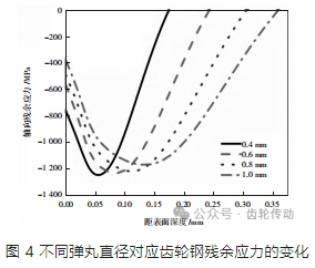從圖 4 中可以看出,隨著彈丸直徑從 0.4 mm 增大至 1.0 mm,對應所冶煉形成齒輪鋼的表面殘余應力從 756 MPa 下降至 378 MPa,降幅達 50%;次表面的最大殘余應力從 1 263 MPa(距表面深度 0.06 mm)降低至 1 171 MPa(距表面深度 0.14 mm),降幅為 7%;殘余壓應力層和最大殘余應力的深度分別由 0.17 mm 和 0.06 mm 增加至 0.35 mm 和 0.14 mm。