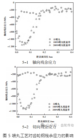 基于上述冶煉過程中的齒輪鋼進行強化處理,并采用便攜式 X 射線衍射儀對強化后齒輪鋼的殘余應力指標進行測量,以驗證上述噴丸工藝有效性。基于便攜式 X 射線衍射儀對未噴丸、100%噴丸覆蓋率以及 200%噴丸覆蓋率對應的軸向殘余應力和切向殘余應力進行測試,對測試結(jié)果進行統(tǒng)計后得出如圖 5 所示的結(jié)論。