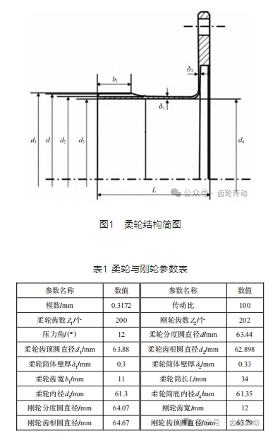 本文以某禮帽形諧波減速器為主要分析對象。禮帽形柔輪在負載增加的情況下所受應力的增幅遠遠低于杯形柔輪的增幅,因此比較適合大負載傳動,柔輪與剛輪的齒廓采用雙圓弧形式,凸輪為標準橢圓且近似為剛體。根據減速器負載和安裝要求,給出柔輪的結構簡圖如圖1所示,柔輪與鋼輪的基本參數取值見表1。