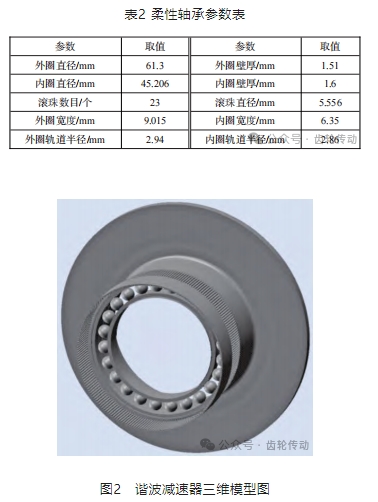 柔性軸承作為波發生器中最主要的組成部分,它與普通軸承有顯著的區別,柔性軸承的內外圈壁厚很小且具有柔性,因此在與凸輪裝配后可以隨著凸輪輪廓曲線產生強制彈性變形。根據靜力學分析,滾子在周向的位移主要受保持架約束,各個滾子之間周向間距基本不變,所以在進行有限元分析時將波發生器簡化為不含保持架的柔性軸承和凸輪兩部分。軸承外圈外徑應和柔輪變形前的內徑相等,柔性軸承的參數見表 2。在三維建模軟件 SOLIDWORKS 中,以凸輪軸向為Z軸、短軸為X軸、長軸為Y軸完成減速器三維模型的裝配,如圖2所示。