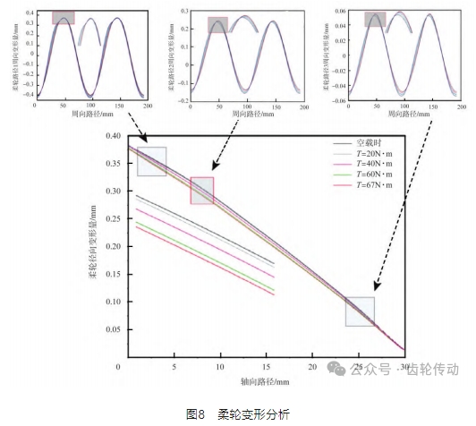柔輪沿著軸向的徑向變形量與距離并不是線性關系,而是具有非常明顯的非線性特征,在越靠近杯口的位置其非線性特征越明顯,隨著負載的增加,柔輪的最大徑向變形量逐漸減小,而不同載荷下變形量差別最大的位置并不是柔輪端面,而在靠近端面距離約7mm的位置,即柔輪齒軸向最大嚙合深度位置,該位置嚙合齒數寬度最長而且嚙合齒數最多,嚙合齒對分擔了絕大部分負載,所以加載后該位置受沿著齒面法向載荷作用產生壓縮變形最大,導致其徑向變形量減小最明顯。