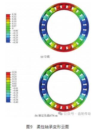 為了進一步探究造成柔輪應力分布及變形規律的原因,對同樣具有柔性的薄壁軸承進行分析顯得十分必要。圖9為柔性軸承在空載和受載時的徑向變形云圖,從圖9中可知,柔性軸承被剛性凸輪撐開后,其長軸和短軸的最大徑向變形為0.38mm,已知理論的徑向變形量為0.3805mm,與有限元分析結果基本一致;在鋼輪上施加額定負載67N·m 后,柔性軸承的長、短軸變形略有變化。