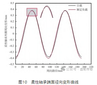 加載后柔性軸承外圈的徑向變形量變化較內圈變化明顯,圖10詳細給出了空載和加載狀態下沿著軸承圓周方向其外圈外端面的徑向變形情況,加載后外圈長軸的徑向變形減小,而短軸增大,這是因為加載后長軸端受到了柔輪上嚙合齒的載荷作用而壓縮長軸,軸承沿著扭矩方向轉動,導致短軸的徑向變形增大。
