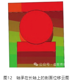 為了進一步分析軸承在軸向的徑向變形特征,圖12給出了軸承在長軸上的剖面變形云圖。從圖12中可知,實際情況下的柔性軸承變形遠比等效凸輪復雜。實際上,由于柔性軸承內圈表面與凸輪表面屬于過盈配合,其徑向位移受到凸輪限制,軸向徑向變形基本一致;而軸承外圈沿著軸向卻有非常明顯的傾斜,導致軸承外圈呈現出喇叭口的變形,主要是因為軸承外圈在安裝過程中是由柔性軸承和滾子約束其徑向位移的,所以在柔性軸承裝入柔輪并發生橢圓變形后,外圈與柔輪內壁的接觸是從軸承內端面至外端面,導致軸向并不是都與柔輪內壁發生了接觸,這也是柔輪徑向變形量沿著軸向呈現出非線性的主要原因。