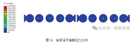 圖 14 給出了軸承空載和加載下滾子與外圈接觸時滾子的接觸壓力分布情況。從圖中可知,滾子上接觸壓力呈現細長橢圓形,加載前與外圈接觸的滾子位置具有最大接觸應力為529.1MPa,而加載后該位置的接觸壓力上升到679.9MPa,且滾子壓力分布也與滾道類似,沿著長軸一側偏移。