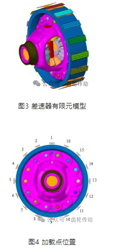 為縮短計算時間和計算差速器運轉一周內殼體各關鍵部位的應力大小及變化規律,沿圓周方向設置16個均勻分布的齒輪嚙合力加載點,得到差速器有限元模型如圖3 所示,其中加載點位置如圖4 所示。