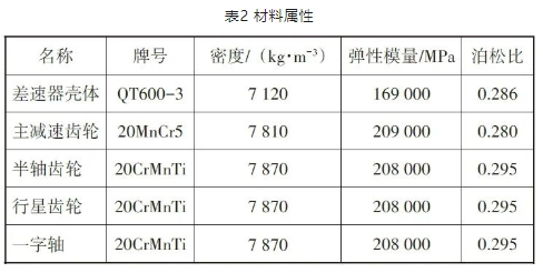 差速器殼體材料為QT600-3,抗拉強度為600 MPa。主減速齒輪材料為20MnCr5,行星齒輪、半軸齒輪以及一字軸材料均為20CrMnTi,各材料屬性見表2。
