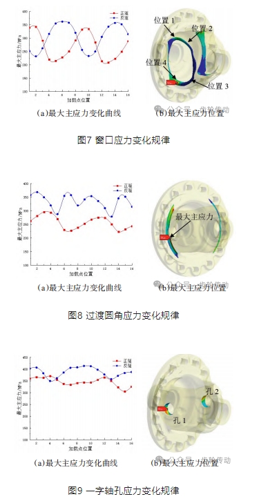 差速器殼體各部位最大主應力的變化規律如圖5~9所示,最大主應力大小基本均呈180°周期性變化,但相位變化各不相同。圖5中軸頸圓角1處最大主應力位置不隨加載位置變化而變化;圖6中軸頸圓角2處最大主應力位置隨加載位置不同呈圓周分布;圖7 中窗口處最大主應力位置只可能出現在4個位置處;圖8中過渡圓角處最大主應力出現在過渡圓角與一字軸孔交接處;圖9 中一字軸孔處最大主應力位置隨著加載位置變化而在兩個孔之間交替變化。