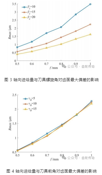 各車齒工藝參數對齒面法向誤差的影響規律如圖 3、圖 4 所示。由圖可知,在試驗參數范圍內,保持刀具螺旋角或刀具前角不變的情況下,隨著軸向進給量的增大,齒面最大法向誤差值 Rmax 隨之增大,且變化幅值較大。這是由于軸向進給量的增加會導致刀具每齒切削厚度增大,波紋誤差的波距變大,刀齒在單位時間內切除材料的體積隨之上升,切削力隨之增大,故表面粗糙度增加,表面形貌變差。