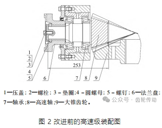 根據(jù)現(xiàn)場實(shí)際使用情況,拆下減速器高速級結(jié)構(gòu)的部件進(jìn)行分析研究,電機(jī)車減速器第一級圓錐齒輪傳動在減速器高速級,牽引電機(jī)通過萬向聯(lián)軸節(jié)與法蘭盤連接,當(dāng)電機(jī)高速運(yùn)轉(zhuǎn)時(shí),第一級圓錐齒輪的小錐齒輪軸(以下簡稱“高速軸”) 高速運(yùn)轉(zhuǎn),改進(jìn)前的高速級裝配圖見圖 2。