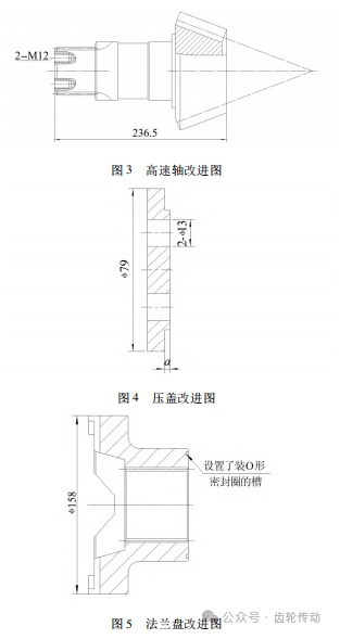 (1) 減速器上箱體外部空間狹小,不僅要保證減速器高速級法蘭盤與萬向聯(lián)軸節(jié)連接方式不變,還要保證高速級錐齒輪嚙合狀態(tài)良好。高速軸裝配后,為使 2 個 M12 螺栓頭部端部離萬向聯(lián)軸節(jié)相對距離大一些,只能縮短高速軸長度,對高速級裝配進(jìn)行設(shè)計(jì)改進(jìn),經(jīng)過反復(fù)推算,將高速軸長度縮短至 236.5 mm,2 個 M12 螺栓頭部端部離萬向聯(lián)軸節(jié)相對應(yīng)距離增長 16.5 mm,杜絕了螺栓頭部與萬向聯(lián)軸節(jié)干涉,保證了高速級的裝配尺寸不發(fā)生變化。