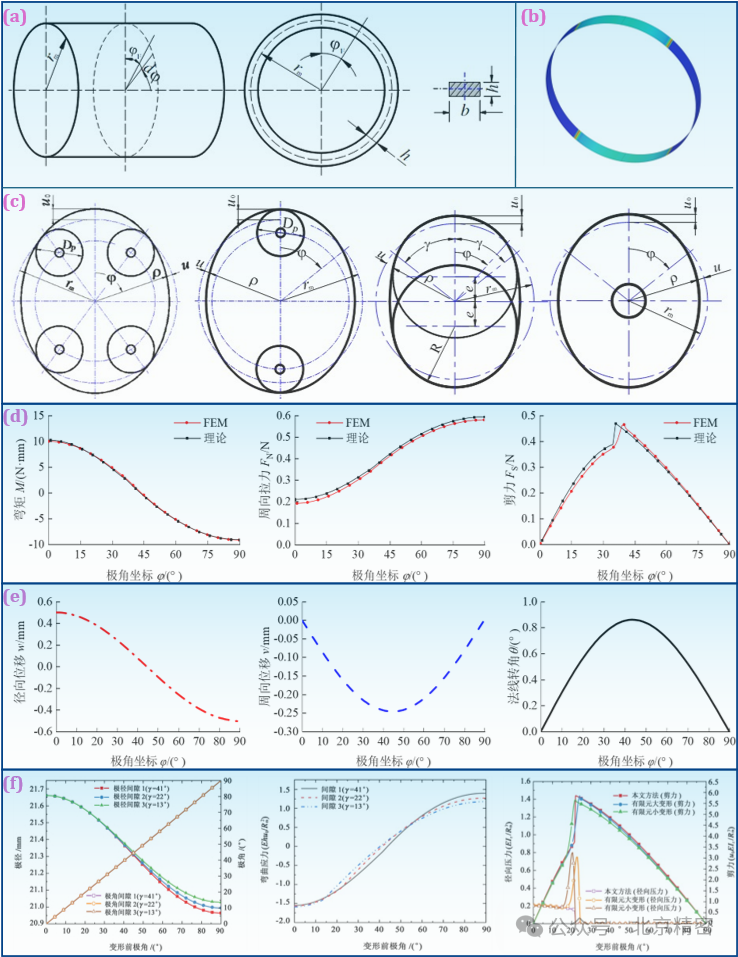 諧波齒輪減速器是基于柔輪彈性變形的齒輪傳動機構,柔輪的變形對齒廓設計和嚙合質量有至關重要的影響。圓環(huán)模型(圖1a、1b)是柔輪變形分析和計算的基礎理論模型。課題組研究了圓環(huán)模型變形的強制幾何約束、力平衡及連續(xù)性等條件,對包括四滾輪、雙圓盤和凸輪(圖1c)等多種波發(fā)生器作用形式下柔輪變形分析的圓環(huán)模型進行了受力分析,研究了考慮力學作用(圖1d)的柔輪中性層變形(圖1e)。提出了凸輪作用形式下基于包角分段的內力和變形計算方法,能夠在具有配合間隙的條件下準確計算變形內力和位移(圖1f)。