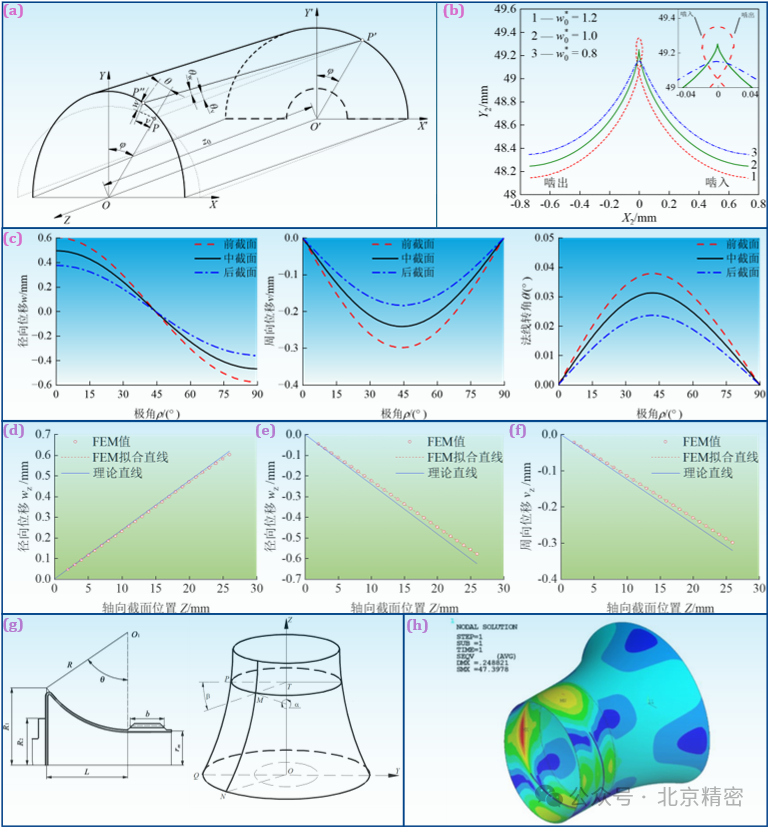 圖2 柔輪的三維空間變形特性:(a) 柔輪空間變形示意圖; (b) 齒圈不同截面上變形運動的三種特征軌跡; (c) 齒圈前中后三截面上的位移結果; (d) 柔輪長軸上沿軸向分布的徑向位移結果; (e) 柔輪短軸上沿軸向分布的徑向位移結果; (f) 柔輪45°位置處沿軸向分布的周向位移結果; (g) 鐘形柔輪結構示意圖; (h) 鐘形柔輪有限元模型的變形.