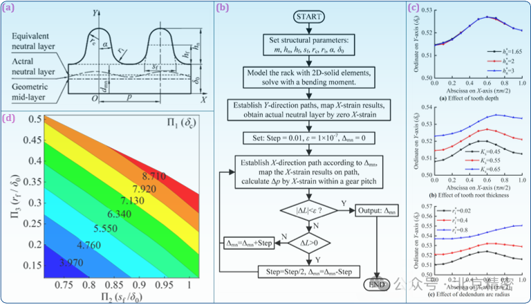 圖3 輪齒影響下的齒圈中性層:(a) 齒圈中性層示意圖; (b) 中性層偏移率計算方法流程圖; (c) 偏移率的敏感性分析結果; (d) 偏移率的量綱分析結果.(3) 隔板變形與應力