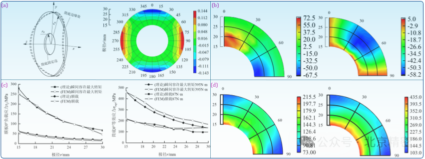 結構扁平化是諧波減齒輪的主要發(fā)展方向之一,但隨著柔輪軸向尺寸的相對減少,此前在長筒條件下對軸向位移忽略不計的假定將帶來越來越大的偏差。圖2中已展示了在隔板約束下柔輪將產生空間的錐度狀變形,當柔輪長徑比降至1/3時,筒底的變形及其應力也產生了顯著的影響。為揭示超短筒諧波齒輪柔輪筒底裝配變形及應力形成機理,課題組建立了樣條函數(shù)表達的筒底隔板圓盤彎曲變形模型(圖4a),提出了隔板的撓度變形和應力的理論計算方法,分別計算了裝配和負擔扭矩狀態(tài)下的隔板應力(圖b-d)。(4) 波發(fā)生器