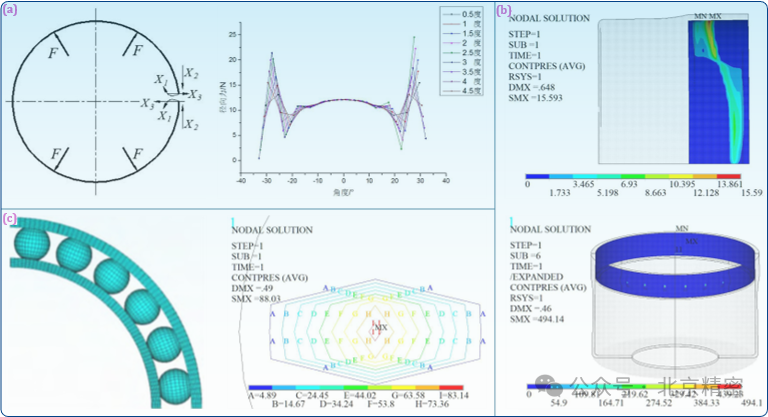 除了波發(fā)生器迫使柔輪發(fā)生變形之外,柔性軸承在凸輪作用下的變形也是值得關注的研究內容。在滾珠的往復接觸和摩擦下,柔性軸承的故障也是諧波齒輪減速器失效的主要原因之一。因此,分析柔性軸承的實際工作狀態(tài),判斷滾珠的實際接觸位置和接觸里分布特征具有現(xiàn)實的工程意義。課題組基于集中力作用下的圓環(huán)變形模型(圖5a),提出滾珠多角度接觸力疊加法迭代計算模型,實現(xiàn)了柔性軸承滾珠實際接觸的理論判斷和接觸力的計算。建立了柔性軸承與柔輪間接觸的有限元仿真模型(圖5b),充分考慮了軸承內外環(huán)與滾珠間的接觸關系,驗證了滾珠的接觸,分析了滾珠與溝道之間的接觸應力(圖5c)。