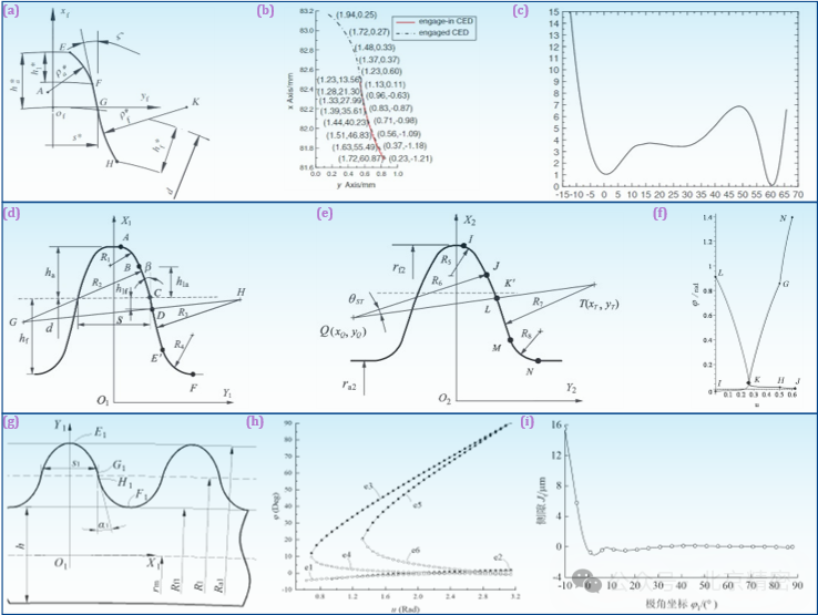 圖6 雙圓弧、三圓弧及擺線齒廓設(shè)計:(a) 公切線型雙圓弧齒廓; (b) 雙圓弧齒廓的二次共軛設(shè)計; (c) 雙圓弧齒廓的嚙合側(cè)隙; (d) 三圓弧柔輪齒廓; (e) 三圓弧剛輪齒廓; (f) 三圓弧齒廓的共軛范圍; (g) 變系數(shù)擺線齒廓; (h) 變系數(shù)擺線齒廓的共軛范圍及多次共軛; (i) 變系數(shù)擺線齒廓的嚙合側(cè)隙.