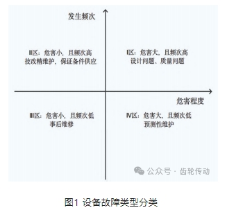 預測性維護是一種先進的設備維護方法,但并不適用于所有的系統或部件。預測性維護的核心是對狀態的發展趨勢進行預測,預測的前提是系統或部件的劣化是有趨勢或是緩慢變化的,對于毫無征兆的突發失效,預測性維護無能為力。同時,預測性維護的成本較高,對于頻繁發生但影響不嚴重的故障同樣不適用。以故障發生頻次與故障危害程度作為兩個評價維度,將故障進行分類,分類結果如圖 1 所示。