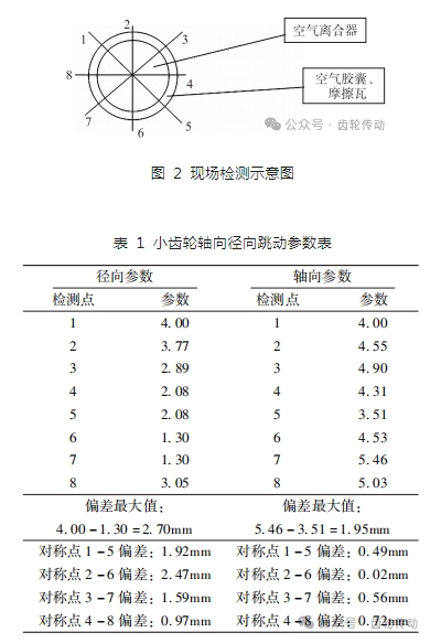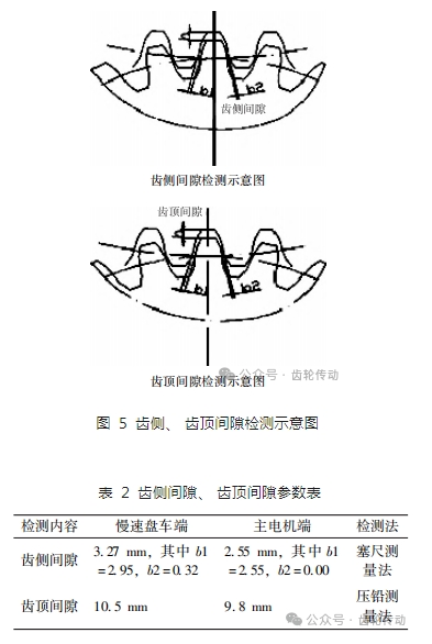 從表 2 中數(shù)字看,齒頂間隙超出廠家標(biāo)準(zhǔn)值(齒頂間隙 5. 5mm,齒側(cè)間隙 1. 88 mm)。由于大小齒輪形為斜齒,檢查齒輪嚙合情況時(shí)是以齒側(cè)間隙參數(shù)為準(zhǔn)則,齒頂間隙參數(shù)只做參考。