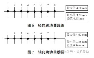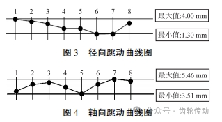 根據(jù)表 1 內(nèi)的各參數(shù)值,分別畫出徑向和軸向跳動(dòng)曲線圖,如圖 3、圖 4 所示。