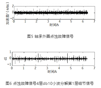 第1層細(xì)節(jié)信號d1已經(jīng)能明顯看出周期性突變信號的存在,它對應(yīng)了齒輪崩齒故障引起的周期性沖擊信號。將5測點位置的軸承設(shè)置為外圈點蝕故障,它的型號和幾何參數(shù)如表1所示。