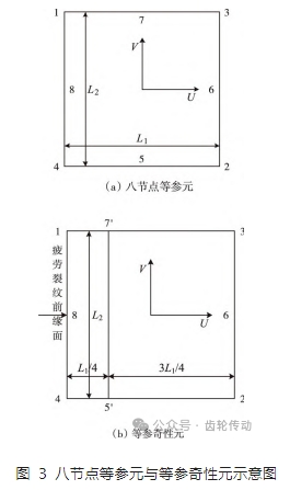 由線性斷裂力學分析可知,齒輪內部疲勞裂紋前緣應力場與應變場存在著一定的奇異性,為了更加精準的分析齒輪內部力學特性,利用奇異性邊界元法獲取齒輪內部疲勞裂紋邊界應變性質,以此為基礎,計算齒輪內部疲勞裂紋應力強度因子,為后續研究提供數據支撐。其中,采用八節點等參元方法對齒輪內部疲勞裂紋邊界進行處理,其插值函數表達式為: