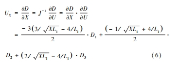式(6)中,UX 表示的是橫軸方向對應的齒輪內部疲勞裂紋邊界應變數值;D 表示的是位移數值;J-1表示的是雅可比式輔助因子,其取值范圍為[0,1];L1 表示的是齒輪內部疲勞裂紋的長度;D1 、D2 與 D5 表示的是插值點 1、插值點 2 與插值點 5 對應的位移數值。