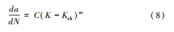是每循環的裂紋擴展長度;C 是常數;K 是應力強度因子;Kth是裂紋開始擴展所需的最小應力強度因子。
