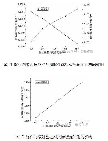 由圖 4、圖 5 分析可知,梯形絲杠的實際導程角與梯形絲杠副的徑向配作間隙呈正比,配作螺母的實際導程角與梯形絲杠副的徑向配作間隙呈反比。梯形絲杠副的實際螺旋升角嚙合偏差與其徑向配合間隙值呈正比,在徑向配作間隙 0. 3 ~ 0. 7 mm 范圍內,實際螺旋升角嚙合偏差最大為 0. 016°,即 0. 96′,考慮到梯形螺紋牙型半角存在偏差,徑向配作間隙對傳動平穩性的影響可以忽略,其徑向配作間隙僅影響傳動過程的發熱與存儲潤滑油。