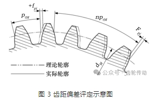在 ISO 1328—1: 2013 中,對齒距偏差評定給出了示意圖,如圖 3 所示。圖 3 中,dM 為被測齒輪的分度圓直徑; z 為被測齒輪的齒數; n 為任意選取的齒數; ptM為被測齒輪的理論齒距值,PtM =πdM /z。
