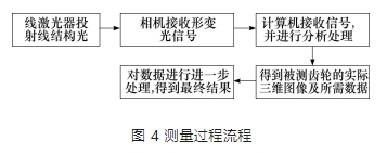 該次測量采用由北京工業大學與哈爾濱精達測量儀器有限公司等單位聯合開發的基于對齒輪齒距偏差的測量,并結合線結構光測量技術的新型復合齒輪線結構光測量系統,其測量過程流程見圖 4。