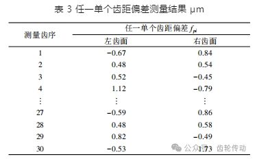 在線結構光測量系統中進行被測齒輪的齒距偏差測量,任一單個齒距偏差測量結果如表 3 所示。