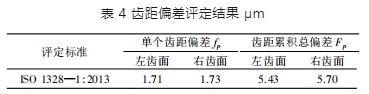 由圖 7 所示可知,左齒面任一齒距累積偏差在第 1 個齒達到最小值-0.67 μm,在第 25 個齒達到最大值 4.76 μm; 經計算,左齒面齒距累積總偏差為 5.43 μm。同理,由圖 8 所示可知,右齒面任一齒距累積偏差在第 11 個齒達到最小值-1.07 μm,在第 30 個齒達到最大值 4.63 μm; 經計算,右齒面齒距累積總偏差為 5.70 μm。經計算分析可得被測齒輪的齒距偏差評定結果,如表 4 所示。