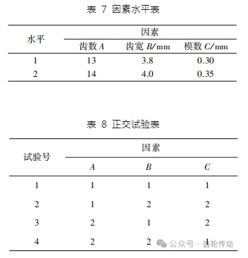 選取行星輪齒數(shù)、模數(shù)和齒寬 3 個參數(shù)作為正交試驗因素,每個影響因素取兩個水平,設(shè)計 L4(23)正交表,三因素水平表如表 7 所示,正交試驗表如表 8 所示。