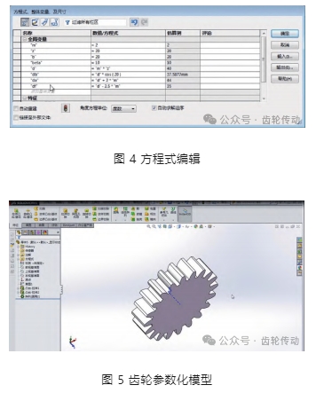 通過鏡像、裁剪、旋轉復制等操作,構建出齒輪的參數化模型。工作界面中,點擊“工具”按鈕插入方程式,編輯模數 m、齒數 z、齒寬 b、齒厚 s、壓力角 α (標準壓力角為 20°)、螺旋角 β(斜齒輪),分度圓直徑 d = mz、基圓直徑 db = dcosα、齒頂圓直徑 da = d + 2m、齒根圓直徑 df = d - 2. 5m、齒厚 s = m × π/2,圖 4 為編輯變量、賦值等。構建出的齒輪參數化模型, 如圖 5 所示。想通過 SolidWorks 相關插件和參數化方法來簡化、解決問題,只需將相關數據輸入到插件中,便可獲得想要的齒輪。
