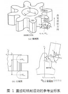 為便于準確描述齒輪銑削過程中的刀具與工件的相對位置關系,建立如圖 1 所示的坐標系。直齒輪銑削過程中,所有輪齒具有相同銑削加工策略;在單個輪齒的銑削過程中,銑刀在齒高方向上以空切的方式移動刀具,再以齒寬方向即沿齒輪軸向進給完成材料銑削去除,重復齒高方向移刀和齒寬方向切削直至加工出整個齒面。坐標系統中定義的坐標系為: