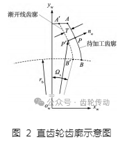 切觸區域計算需要精確描述代加工工件模型;對于直齒輪,代加工工件的表面為漸開面等距面,其可以表示為代加工齒廓沿軸線拉 伸所形成的幾何體。齒輪銑削精加工完成齒廓漸開線的最終包絡,其前一道工序半精加工之后的待加工齒廓為包含加工余量的漸開線等距線。圖 2 為直齒輪端面齒廓示意圖。漸開線齒廓 A′B′上任意一點 P′的坐標為: