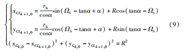 由圖 3 可知,Gk,0 為殘留高度點,是曲線 ε2 和刀位點 CLk,0處刀具圓弧交點,Gk,0點可通過式(8)求取。