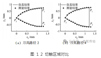 圖 11 中刀具路徑 2 和 4 的測量結果與仿真計算結果的對比如圖 12 所示,曲線 P1P2 和曲線 P2P3 的實際測量結果與仿真計算結果基本一致;曲線 P1P3 在實際工件表面中,由于工件的滑移變形,該邊界曲線比較模糊,難以辨識,而實際測量結果可以看出,P1 點和 P3 點及其相鄰點的測量結果與仿真結果相一致,同時相鄰測量點趨近于代表刀具痕跡的直線,間接說明曲線 P1P3 實際測量結果與仿真計算結果具有一定的吻合度。切觸區域邊界曲線的微小誤差是由測量誤差和工件表面塑性變形的影響所導致的。若排除測量誤差和工件表面變形的影響,試驗結果與仿真結果基本一致,從而證實了本文所提出切觸區域仿真分析方法的準確性。