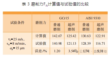 如表 3 所示,將最后一組試驗參數代入經驗公式,對比計算值與試驗值,可見其誤差均在 10% 以內,說明所建立的法向磨削力數學模型與試驗數據擬合度較好。此外,普通磨削的誤差小于超聲磨削,這是由于超聲條件下磨粒常因沖擊產生隨機破碎,僅考慮 3 個輸入變量的經驗公式不足以描述磨削力與磨削參數間的關系。若誤差過大則可以考慮采用神經網絡法,處理超聲磨削中復雜的輸入輸出關系,以指導磨削加工用量的制定。