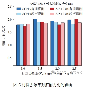 與磨削力相同,磨削力比也是評價磨削過程中材料磨削性能的重要指標。圖 6 顯示了材料去除率對磨削力比的影響。普通磨削中力比的變化范圍較大,GCr15 和 AISI 9310 在普通磨削中力比的變化范圍分別是 1.79~2.02 和 1.74~2.01,而在超聲磨削中力比則較為穩定,變化范圍分別是 1.82~1.89 和 1.82~1.87,顯示出白剛玉砂輪在超聲磨削淬硬齒輪鋼時優良的磨削性能。當材料去除率為 1 mm3 /(mm·s)時,超聲磨削中砂輪磨粒因受到沖擊而破碎,其磨損程度大于普通磨削中砂輪的正常磨損,導致超聲磨削力比大于普通磨削;當材料去除率為 2.5 mm3 /(mm·s)時,普通磨削中砂輪磨損加劇,GCr15 和 AISI 9310 表面的磨削力比分別增大 11.07% 和 15.71%,而超聲磨削力比變化不大,且比普通磨削減少了 8.46% 和 7.04%。由此,證明了超聲振動輔助磨削工藝有助于增大磨削加工參數,并將材料去除率提高了 2.5 倍,提高了加工效率。