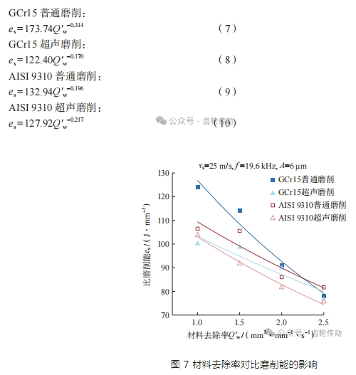 比磨削能 es 作為磨削過程中最重要的物理量之一,由磨削力與加工工藝參數推導而來,反映了去除單位體積工件材料的過程中所消耗的能量。圖 7 顯示了材料去除率對比磨削能的影響,GCr15 與 AISI 9310 淬硬表面的比磨削能曲線由最小二乘法擬合得到,可表示為式(7)~(10)。