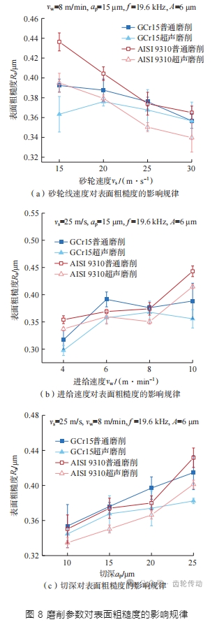 工件表面粗糙度是衡量磨削加工表面完整性的一個重要指標。磨削參數對表面粗糙度的影響規律如圖 8 所示。超聲磨削能夠降低表面粗糙度,如圖 8(a)所示,隨著砂輪線速度從 15 m/s 增大至 30 m/s,表面粗糙度呈減小的趨勢,超聲條件下,GCr15 與 AISI 9310 表面粗糙度最高降低 7.39% 與 9.47%;如圖 8(b)所示,隨著進給速度從 4 m/min 增大至 10 m/min,表面粗糙度呈增大的趨勢,超聲條件下,GCr15 與 AISI 9310 表面粗糙度最高降低 8.62% 與 6.41%;如圖 8(c)所示,隨著磨削深度從 10 μm 增大至 25 μm,表面粗糙度呈增大的趨勢,超聲條件下,GCr15與AISI 9310 表面粗糙度最高降低 7.79%與7.03%。表面粗糙度 Ra 與已加工表面的材料殘留高度有關,切向超聲振動輔助磨削中砂輪對工件反復熨燙,有助于降低表面粗糙度。
