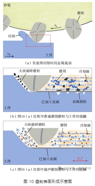 圖 9 為加工后工件表面的微觀形貌。在熱、機械復合作用條件下,普通磨削中存在較大范圍的材料斷裂、破損、再沉積及涂覆等表面缺陷(圖 9(a)和(c));與普通磨削相比,超聲加工表面呈現出良好的表面紋理,無明顯的表面損傷(圖 9(b)和(d))。磨削表面形貌是由砂輪上的眾多磨粒對工件表面進行摩擦、耕犁、切削等綜合作用的結果。磨粒通常被認為具有負前角的 特性,磨屑從前刀面流出,圖 10(a)顯示了負前角切削時的金屬流動。如圖 10(b)所示,普通磨削中磨粒不斷接觸工件,導致冷卻液無法進入前刀面,前刀面的熱量增加,材料的塑性流動作用增強,磨屑容易黏附在砂輪表面,產生再沉積缺陷,未成屑材料黏附在加工表面上,產生涂覆缺陷。此外,由于砂輪的擠壓,冷卻液中混入的大尺寸磨屑及破碎磨粒相當于游離磨料,容易對已加工表面造成材料的斷裂、破損等缺陷。超聲磨削中磨屑及破碎磨粒的尺寸更小,并且通過磨粒和工件的周期性分離改變冷卻液的流場,及時帶走熱量和磨削產物。因此,超聲振動中斷續磨削和往復熨燙的特性可以改善加工表面缺陷,有利于提高工件表面完整性。