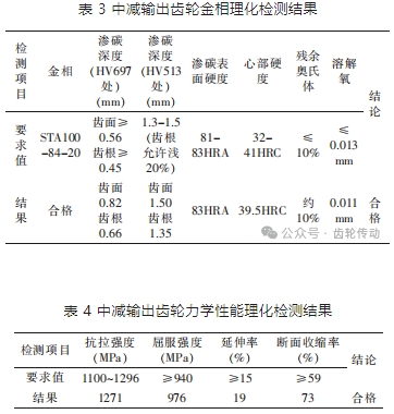 對故障件中減輸出齒輪進行理化分析,理化檢測結果合格(見表 3、表 4)。