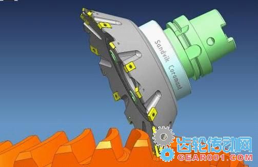 在使用可轉位圓刀片打開齒槽后,再采用新型銑削刀具概念加工齒側面。刀具類型可分類為中間工序加工用刀空心銑刀和鐘形銑削刀具。銑刀軸的安裝角可調,并且銑削刀具輪廓呈細長狀,這樣就能加工出各種牙側角和模數。凸凹兩種齒側面可以采用同一把兩側安裝有刀片的刀具加工而成。如果刀具僅一側配有刀片,以便增加有效刀片數(并由此提高進給率),則可節省相當多的時間。所需的更多換刀只會增加少量的時間。